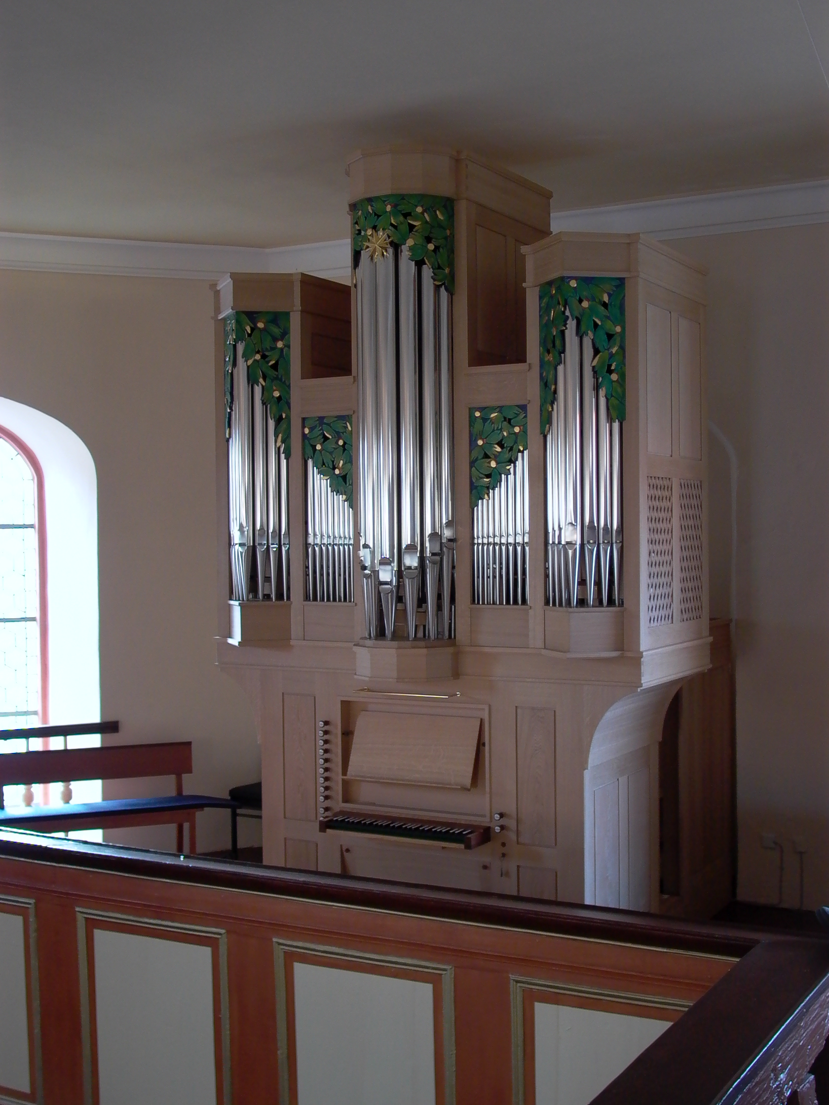 Lichenroth | Ev. Kirche 2007 | Neubau Disposition Manual C-g³Pedal C-c¹Prinzipal 8′Subbaß 16′Gedackt 8′Bassflöte 8′ (Auszug)Salicional 8′PedalkoppelOctave 4′Blockflöte 4′Quinte 3′Octave 2′Mixtur 3-4f 1 1/3′Trompete 8′KanaltremulantZimbelstern