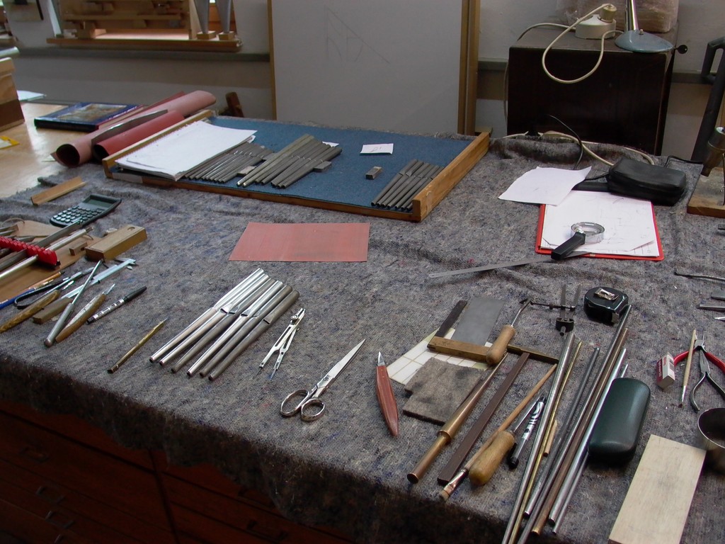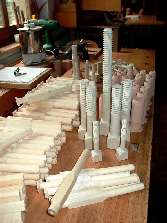 Verleimungen von Holz und Leder werden mit Hautleim (Warmleim) ausgeführt, Holzoberflächen werden mit dem Hobel handverputzt und Metallpfeifen von Hand nach oben abgezogen.